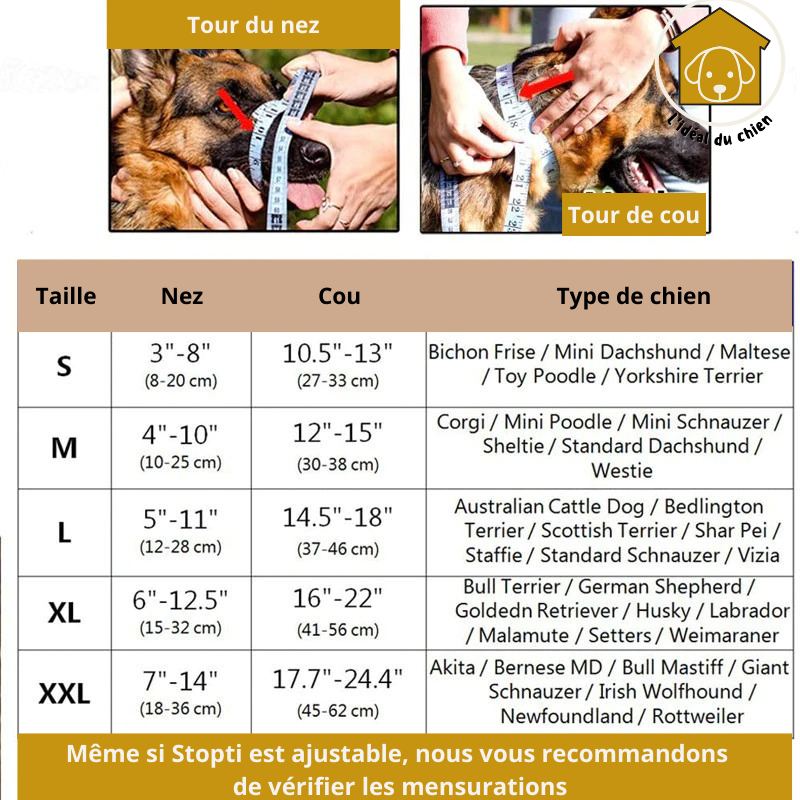 NOTE: Nous vous recommandons de mesurer le museau de votre chien avant l'achat de STOPTI, vous pouvez trouver notre tableau des tailles en images !